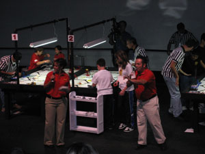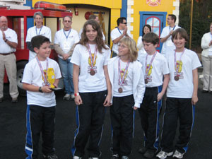 Our robot took a little while to work out, having never built one, and getting used to the brand new MINDSTORMS NXT. We eventually settled on a generic platform that we could attach mission specific attachments to. This worked out great for us. By far our biggest challenge was navigation. We built two jigs to make sure our robot always started in the same exact place, but getting all the way to the other side of the table acurately never quite worked. We will definately be experimenting more with line following in the future. We only competed at one tournament, at LEGOLAND in Carlsbad CA. We were fortunate enough to place 2nd in robot performance (not bad for a first year team!) |