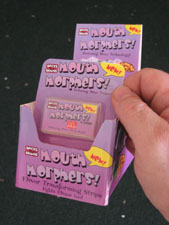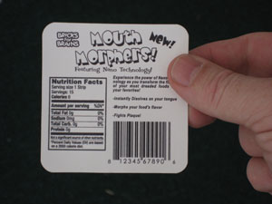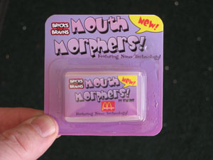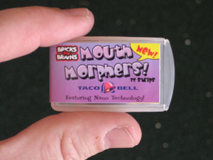 Our 2006 Project was Mouth Morphers, a flavor shifting strip product. You choose what flavors you want your food morphed to and apply the strip to your toungue. There were several flavors to choose from, like Taco bell, McDonald's and Baskin Robins. We created prototype packaging and a 30 second commercial. Our presentation was based on a product development team's pitch to a board of directors. The product used two types of nano robots, one for fighting plaque, one for changing tastes. The NanoTTT (Tribot Taste Transformer) would attach itself the the tastebuds of the tounge and block unwanted tastants while swapping favorable ones. The NanoPHK (Plaque Hunter Killer) would actively hunt down and destroy the bacteria that causes plaque. We scored well with the judges and the other teams. In fact, our prototypes were so convincing that other team members thought they were real and for some reason we were giving away samples. We came back from a short trip around LEGOLAND to find all of our prototype packages gone and children all over the pit area enjoying them. |